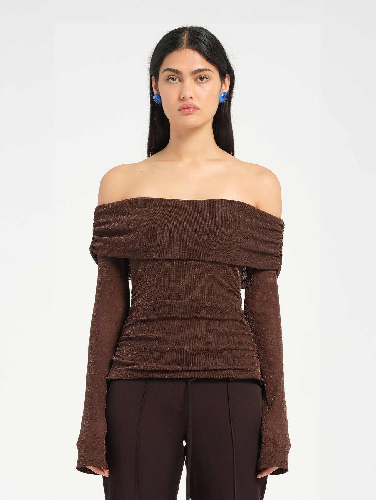 The Blaire Top features an off-shoulder design and elongated sleeves. The design is finished with gathers on the side waistline to hug the body. Designed and styled to pair with the Verner Skirt.