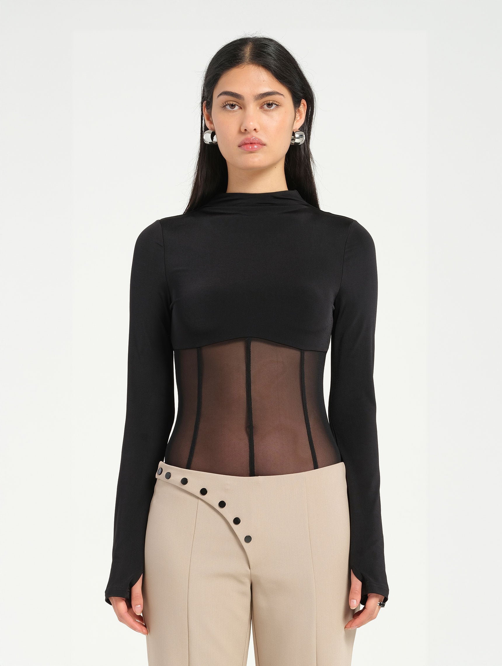 The Lova Bodysuit features long sleeves and a high neckline, crafted from jersey and mesh for a contoured fit. The sheer waist is panelled to accentuate shape. Snap closures at the crotch ensure a secure fit.