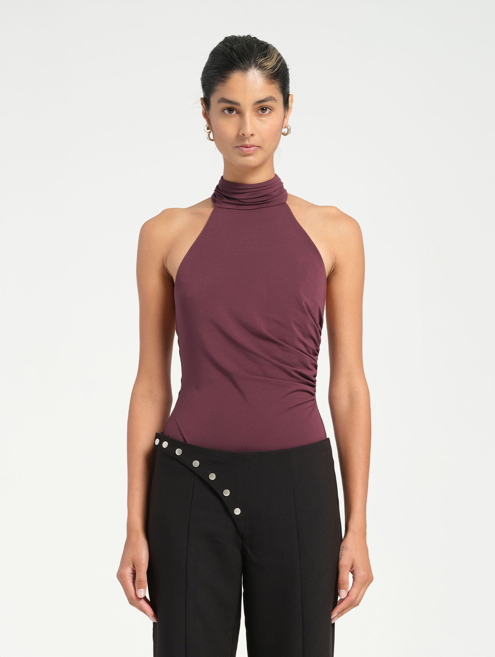 The Lovella Bodysuit features a high neckline with hook-and-eye closures and a racer back. Side ruching defines the waist, while snap crotch closures offer a seamless finish.