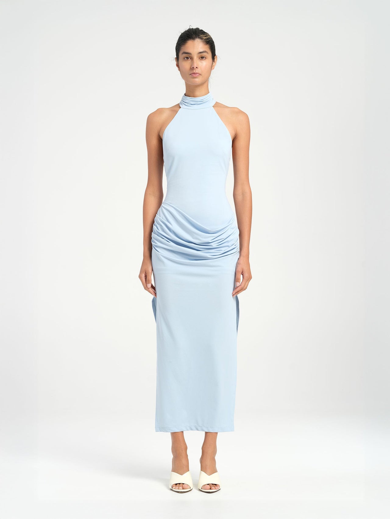 The Lovella Maxi Dress features a high neckline with hook-and-eye closures and a racer back detail. The full length skirt features side splits and is finished with our signature cowl detail.