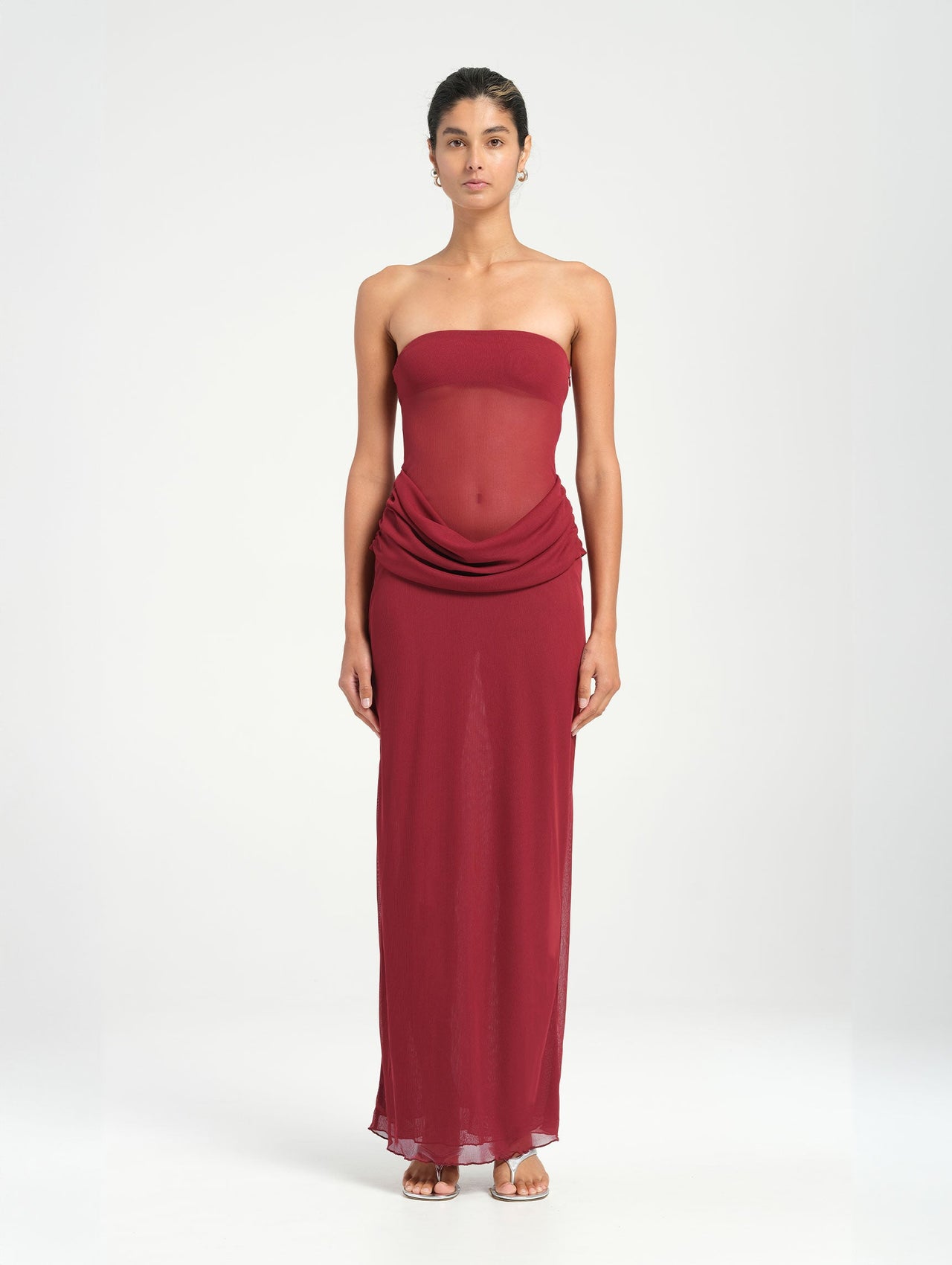 The Petra Maxi Dress features a bandeau neckline and panelled waist detailing. Crafted in a mix of stretch jersey and sheer mesh, the bust is lined for full coverage and the floor length skirt is finished with our signature a draped cowl waist detail.