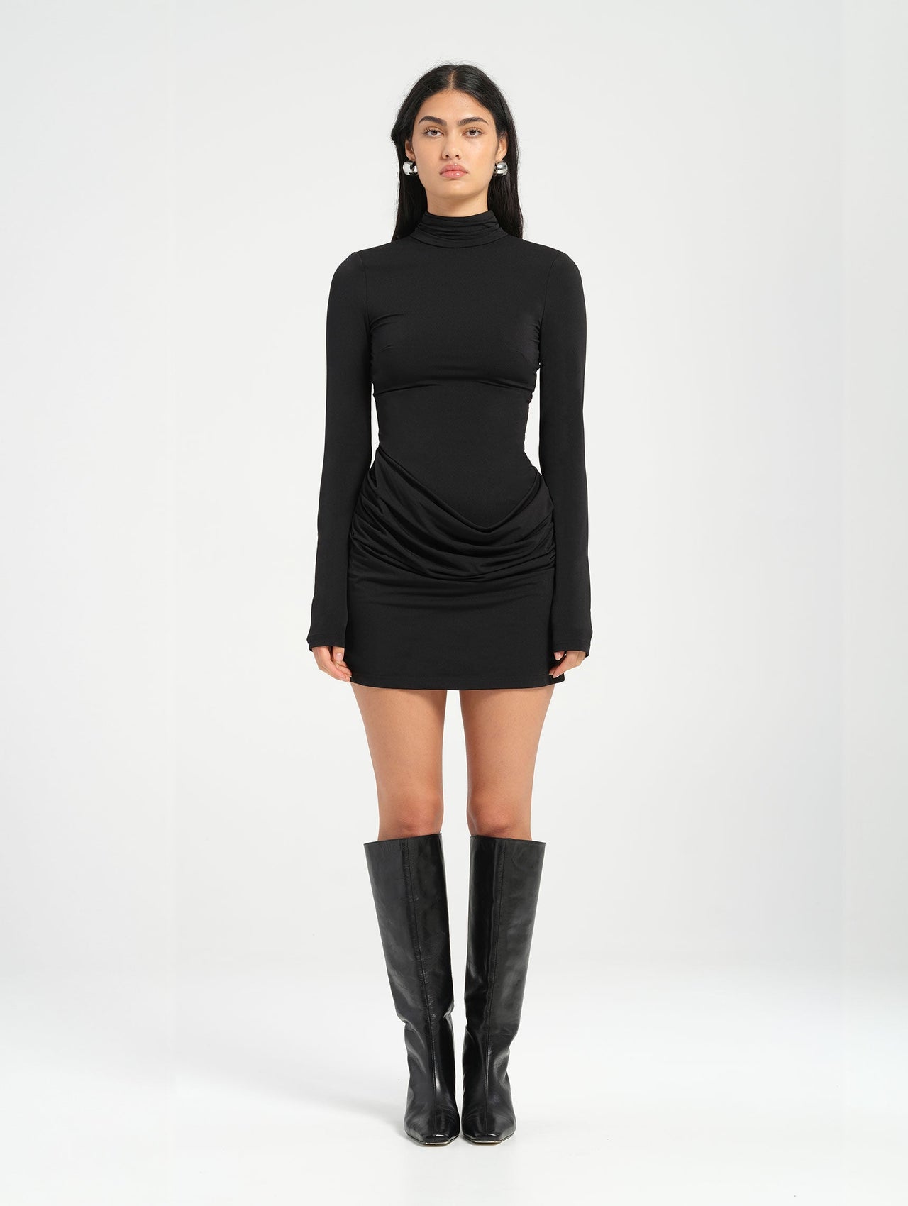 The Veda Mini Dress features long sleeves and a high neckline with back zip closure. Cut from a crepe finish jersey, the cut out racer back detail extends into a high collar neckline. The front skirt features our signature waist cowl detail.